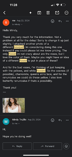 This now makes three brides (that was know of from the reviews) with the same issue—bouquets and florals that were NOT what we requested. I emailed back and forth with the florist and sent my inspiration photo. I was quoted $200 for my bouquet—expensive, but understandable given how full the inspo bouquet was. My only specific request: no roses, which we clearly discussed by email (as shown in my photos). I even paid extra to substitute a different flower.