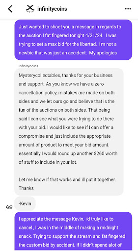 Read moreBidders/buyers Beware !! Kevin and Scott are deceptive online. The whatnot app specifically. Don't ever join one of their streams and make an accidental bid. Thousands of dollars in support over a short period of time gets dismissed over an accidental bid through the app. 300 bucks for 1 ounce of silver. Makes me wonder about alot...I Asked to cancel like a cordial buyer would. They basically responded and said no you're stuck and keeping your money And we will send what we feel is right. Then proceeded to send items they deemed as appropriate For the bid. I would never treat a client of mine this way , let alone a repeat and supportive buyer. I did back track on messages and allowed them to bully me and send me what they felt was appropriate. Due to the terms and conditions of the app. There Is little to no recourse for them otherwise. So I took what I could and will warn others. Also there have been plenty misrepresentation of item value online as well. I'm a victim of it and still continued to support giving the benefit of a doubt. What a shame.