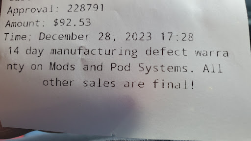 I have purchased 3 - uwell caliburn devices, 4 -120ml house blends, 2 spare pods, 4 spare coils and 4 - custom flavor salt nics so far. Was told to keep my receipt if I had any issues with the new pod systems that I had 14 days to bring it back and they'd help. The 2nd purchase was done on December 28th and I went in today Jan 3rd because 1 of the 3 units is not working like the others you have to fight it to select which coil you want to use. The lady at the front was very friendly tried changing the coils out to see if that would fix the issue it did not (also emptied my full 4ml tank). She went to the back a few times to talk to the manager about it then finally after 10 to 15 minutes the manager came out front and basically said that they are not going to do anything. If you tell people they have 14 days to return a defective device then turn them away when they bring in one within your set time limit I think that's just bad business keep in mind with just the last 2 purchases I spent $259.00 at this location. Honestly until today I would have rated them 5 out of 5 stars but because they won't stand behind their own policy I'm giving...