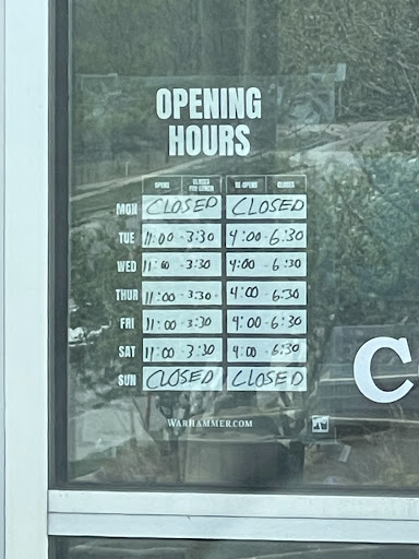 Read moreOfficially licensed Warhammer stores have a reputation in the community for being slightly higher priced than local game stores. However, when I went into this location for the first time after a stressful day at work, I understood that the marginally higher prices were completely worth it. When you walk into this Warhammer store, you are given a consultative experience. Steve (great guy) will make sure you have all the resources available to fully immerse yourself in the activity. He even took the time to explain the rules to me with a mock-battle scenario of...