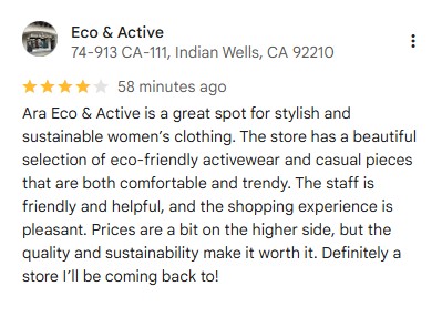 Read moreAra Eco & Active is a great spot for stylish and sustainable women’s clothing. The store has a beautiful selection of eco-friendly activewear and casual pieces that are both comfortable and trendy. The staff is friendly and helpful, and the shopping experience is pleasant. Prices are a bit on the higher side, but the quality and sustainability make it worth it. Definitely a store I’ll be...