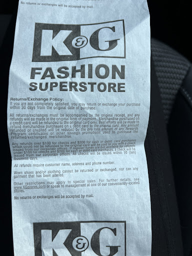 Read moreI went to the store to return two suits that was purchased for my son for an event that they never worn. upon arrival and entering the store. I was greeted by I suppose a security officer who directed me to the to the counter, for my returns. I did provided the cashier both of my suits along with the receipts and my ID. The cashiers stated I’m not giving this much cash out with an attitude, also, she threw the suits down on the counter, as if she did not care never saying anything at the time just a very negative attitude. the manager on duty in which I cannot pronounce her name because of her her hand written signature also was not pleasant. this was not a good experience in customer service at all . after I walked out of the store I said they will never get any money from me again. The issue I had with this whole experience is that not only did this young lady gave me a -1% percent experience in bad customer service. but she was not corrected, or redirected, in her behavior with me being a customer, from her manager. This event took place 5/7/2024 at the K&G fashion superstore located at 4510 E. 82nd St., Indianapolis, IN 46250. I understand we y’all have our days, but nobody should have to go threw this experience, especially when working so hard and spending your money as a consumer. They have to remember there will be no businesses without us, providing the funds to keep them open and when I see stuff like this. It makes me never want to do business again I hope and pray that no one else Has to go to this experience at this location....