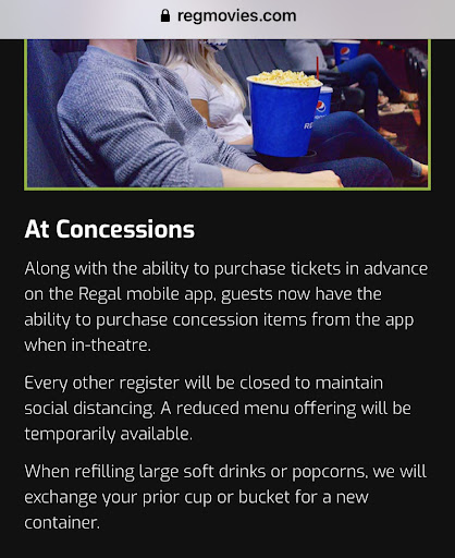 Read moreThis theater is terrible. The staff is incompetent ,illiterate, and ignorant especially Mark and his two managers who think popcorn comes out of their check. The hot dog and popcorn was old very old. Don’t go see a late movie or your beef hot dog will feel like chewing rubber. A bland order of large popcorn which was $9.10. Probably the most I’ve paid for stale tasteless popcorn. They told me I would be able to get a refill of my popcorn. When I came back for the popcorn I saw they were popping a fresh batch so I figured it would taste better. He told me due to COVID they can’t take my bucket back and that was fine because you can give me a NEW BUCKET, but they only REPLACE IT WITH A MEDIUM POPCORN. They said it’s Covid policy but I’ve attached the actual policy, so they lied. I PAID 10 for popcorn and your only going to give me a $7 medium refill. That doesn’t make sense on any aspect. So everyone behind the counter including Mark who’s the popcorn runner got an attitude because I wanted the fresh popcorn not the one that’s in the desk that looks old. So manger yells really loud this will be the one and only last time I will refill a large popcorn. No one washed their hands or used sanitizer while handling my popcorn and their fingers were touching the insides of the bucket. Half the staff had on masks the ones that did wore it underneath their nose. I’ll most likely never go here again. Thanks for the...