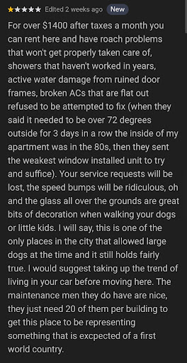 Read moreUnfortunately, we have lived here far too long. If I could give negative numbers as a rating I would. A simple 1 star is not nearly enough. It is currently under new management, but if often times is. Previous management left 200 units without air conditioning for two months in July and August while the average was 92°. At one point we also had horrible leaking in our kitchen which led to a portion of the ceiling caving in, also creating black mold. That took 4 months of calling to get fixed. Maintenance was always sent out, but they would say they needed to go get something only to never return. There was another instance where we called to get our oven fixed, upon the maintenance man leaving I began smelling burning. I got up to go to the kitchen to see that the stove was on, and the rings were bright orange and the oven door was still off. Keep in mind he had left and told me to have a nice day. I contacted the office to let them know, so our door could be put back on, but I was met with a very unnecessary attitude and told, "Maybe he wasn't finished" after informing that he stated he was finished and wished me a nice day. They never sent anyone out despite what I had said. Despite new management I very highly suggest not living here even as a last resort. You will more than likely be surrounded by couples who have screaming matches every other day, if not every day multiple times a day. Where I'm located there is a newly moved in couple who argues from their apartment to the hallway, to outside. When I say every other day, if not everyday, I genuinely mean that. There's a father and daughter also in the building. The daughter caused some drama which led to 6 people arriving to fight her. The mased the entirety of the hallway, and someone even attempted to open our door during the commotion. Before I forget, we've had a disgusting furnace since we moved in. Every now and then it makes a loud booming noise as if someone above us dropping two bowling balls on the floor. Even if the apartment you view appear nice, and there's fresh new paint on the buildings it is sure to fall apart and it will take 2 to 4 months for it to be "fixed", only for it to break down again in a week. You can do better. This isn't worth it.