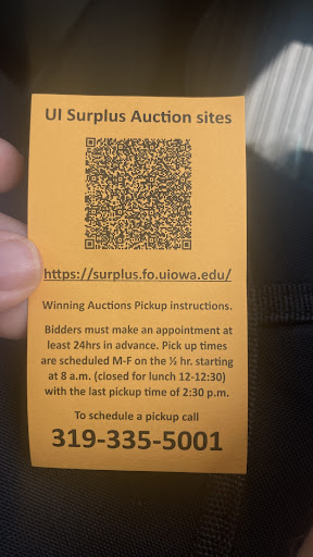 Iowa Surplus auctions old University of Iowa property online through sites like AllSurplus and GovDeals. I've been buying everything from cars to laptops to Iowa gear here for a couple of years now and, although it's like most auctions and some of the items can be unpredictable, they do their best to accurately describe condition and give you the opportunity to inspect items. This is also a fairly busy place at times, so they do require appointments for inspection or pickup, under most circumstances. One thing to note is that you are not allowed to test drive vehicles which are being auctioned, but you can start them. Just recently had an item which didn't end up matching the description and they had me bring it back in, looked at it and did their best to make it right. I left completely satisfied. They had zero obligation to do this since most everything is sold "as is." Obviously they won't always have the ability to help as much as they did in that situation but I will say they are very professional and will do what they can...