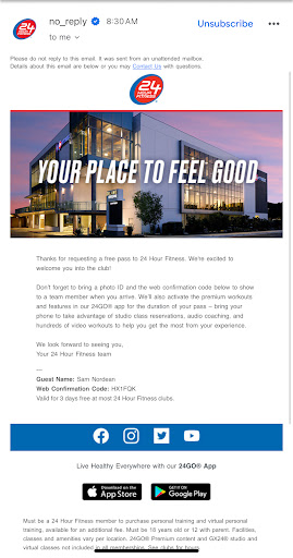 I was on the search for a new gym since I like to workout. So I came across 24 hour marketplace since it is between my house in (NORTH TUSTIN) and my office in Costa Mesa. I signed up for a 3 day pass. The pass specifically said bring your ID and a the email and come to enjoy a workout.