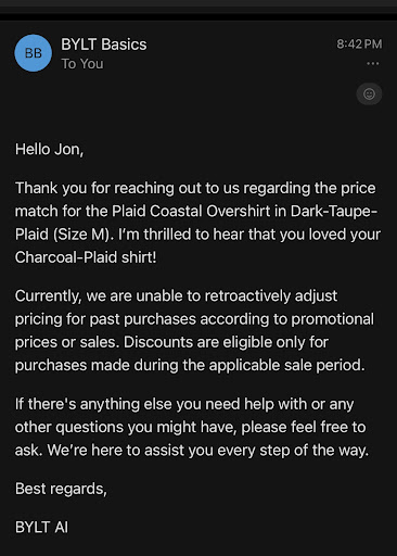 Mistakes happen, and sizes can vary, although the variations between their their Kinetic 1.0 vs 2.0 and Tech Denim seem to be vast. Ultimately though it's not about being mistake-free; it's about the recovery, and BYLT Basics is one of those modern, forward-thinking companies that seem to dissuade live human interaction and doesn't make it easy to reach anyone to initiate a recovery, especially when a customer collides with a bad policy like no returns or exchanges for products purchased through one of the popular social channels. So their options allow you to either choose email for a 2-3 day response time (at least they tell you upfront) or choose chat, which requires you to first sift through all of their pre-programed FAQs and pre-written solutions.