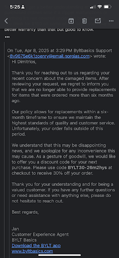 Update 7/8/2024 What makes me the most annoyed/frustrated is that BYLT is clearly putting in so much effort in masking negative reviewers instead of putting that same amount of effort (or any at all) into addressing their pitfalls in management. My issue still isn't resolved as of now. As soon as I check out, it automatically cancels my order. This should take 48 hours for an IT hire to solve, if that. Their practice is simply unethical: they filter reviews and according to others they delete any negative comments on their social media posts. They hold no ownership. And for those wondering, I try to order probably once or twice a year since their ads pop-up every now and then for me and I know the quality is good. It is just that anytime I go to check-out, all of this still isn't resolved which is simply frustrating, and the complete lack of responses entirely is beyond rude.