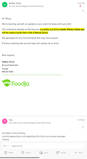 UPDATE: Another issue with Foodja. As an outside sales rep, I’m often on the go and not checking my email while working. Instead of calling 30 minutes before an order is supposed to be delivered to provide updates, they send an email—making it easy to miss important information. When I reached out to request a phone call for better communication, they still didn’t...