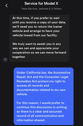 After consulting with a third-party Tesla expert, I learned I had the legal right under California automotive law to request the car’s diagnostic history, which could show whether the first failure occurred during the warranty period. When I politely asked for this record, Abraham refused to cooperate and even threatened to have my car towed. I remained calm and professional throughout — I was simply asking for documentation I’m legally entitled to. (I have attached a screenshot of the message he sent me threatening to tow my car for simply asking for my diagnostic history.)