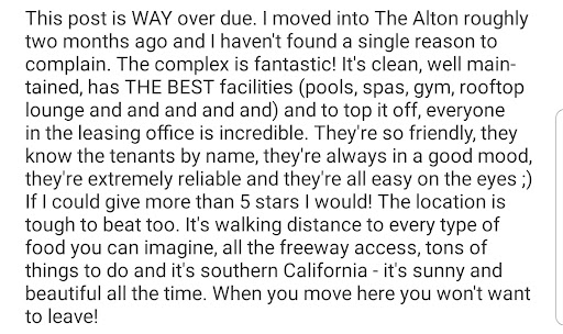 Staff If you are looking for a new place to live in Irvine, I would recommend the Alton to anyone based on just my experience with the team alone. I have had numerous encounters with the very friendly Alton staff, and they are always very responsive to any request and strive to make your home the best they possibly can. I can highly speak of John Kindle in the leasing office. He has continually ensured that everything is up to par and in my opinion, has gone above and beyond what I would expect from leasing staff.