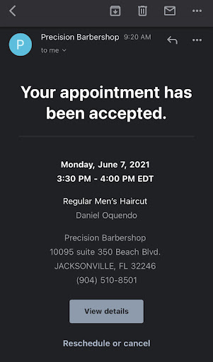 I received an email confirmation 15 minutes later that my appointment had been accepted and it gave me the name of the barber, Daniel Oquendo. When I arrived at 3:25 pm I checked in and to my surprise there was not a barber by the name of Daniel that was there. However one of the barbers onsite said he would text him and he would arrive shortly. I WAITED FOR 45 MINUTES and Daniel never showed up. I patiently waited for the main barber to finish the client he had and it took forever. Some of the barbers were standing around talking and laughing while I continued to wait. FINALLY, the lead barber finished and was able to take me.