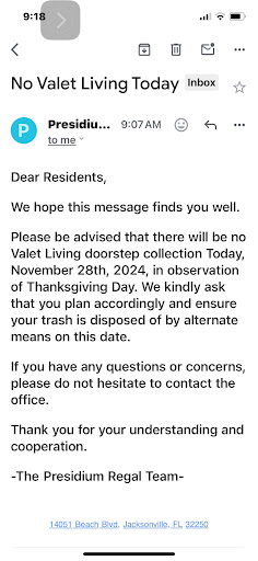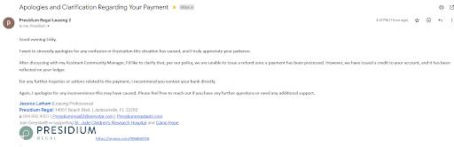 Ā Ā Ā Read moreTo start off this review I'd like to clarify that the leasing agents Jessica Latham and Latasha Douglas have been extremely kind, helpful, and professional throughout this whole process. I am extremely frustrated, but I know that they are just doing their job. The problem is the managers. I signed with Presidium with the promise of 3 months free rent. Last week, instead of putting a month of free rent in my ledger, the manager, Selena Brown, charged me for two months of rent. This payment went through because I have autopay set up on my account to avoid late payments. I didn't realize the situation until I saw that $3,000 had been deducted from my bank account. To her credit, I do not believe this to be any form of malice, just an honest mistake. You might think that this is no big deal, but I do not. This would have been fine and I would not be writing this review had I just received a refund like any normal apartment complex would have given me. However, after a week of calling the office, they have refused to refund me the $1,500 (see the pitiful excuse for a response I got in the screenshot below), and have instead put a credit on my account. Not good enough. Selena Brown claims that this is per their policy and they cannot issue refunds. I don't believe for a second that you can't refund me my money. A friend of mine who lives here was mistakenly charged a $175 late fee. When she confronted the office about it, they gave her the same song and dance and refused to give her a refund and only gave her a credit on her account.