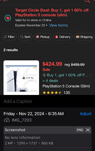 This morning, I saw a promotion on the Target app advertising a PlayStation 5 Slim for $424.99, with an enticing offer of 60% off the second unit. Excited about the deal, my husband and I drove to the store to make the purchase. Prior to leaving, I took a screenshot of the promotion for reference.