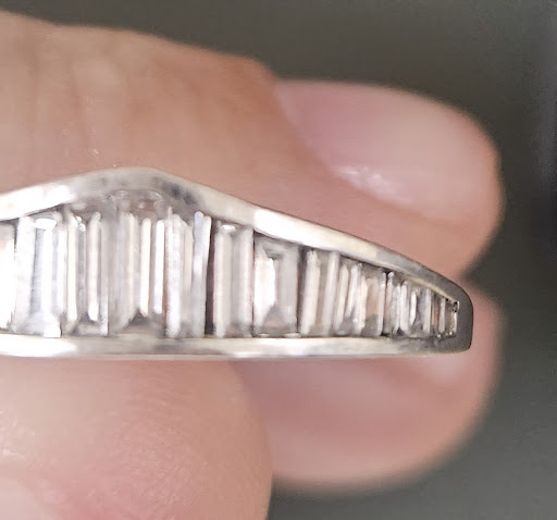 When it was returned to me again, the mark was removed from the resizing, but many of the stones were still crooked in the setting and there were gaps between them. Before giving the ring back to me, the associate was clearly displeased with how it looked, and had it checked again by other staff. They said that it was a learning experience for them, and that they would not take a ring like mine in the future because of the possibility of damage. They said that there was nothing they could do unless I wanted to pay to have them add more diamonds or have them size it back up to a 9.5. They were completely unapologetic at the last interaction, and did not offer to pay for their damage or send it to someone else to have them reset.