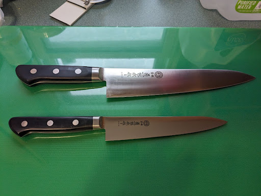 Long story short: went in and came away with these two Kikuichi knives: an 8-inch gyuto and a 6-inch petty knife! The two staff members I chatted with were great at finding a variety of knives within my budget. They then left me with a table of them, a cutting board, and time to experiment and see what really worked for me and what didn't.