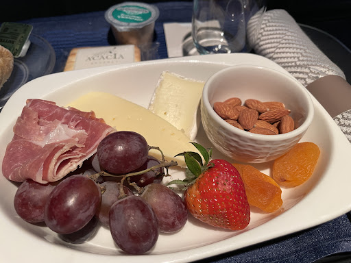 The flight was top-notch. Very smooth, very little turbulence. Service was impeccable. I ordered the Fruit, Cheese, & Nut plate for dinner. They also had Cheese Enchiladas & Lemon Chicken Thighs on the menu, as well as a noodle salad.