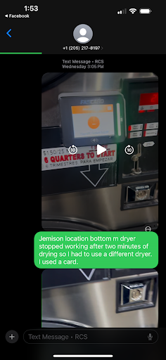 I’ve been using this laundromat for about six months and I’ve never had any issues. I just had major surgery and my husband took our laundry this time. I usually use one dryer and pay for about 45 minutes and it dries everything just fine. My husband split everything into four different dryers and when he started emptying the dryers that we used he realized that our towels weren’t dry. He just seen the dryer not running and assumed that it may need to run again. After swiping our card he seen that the dryer still had time left and now had an additional 20 minutes and was still not running. The owners response is extremely sad in my opinion. They claim that the screen shown on the dryer in the video meant that it was about to end its cycle and go back to requiring $1.50 to start. However had they actually watched the video they’d have seen that the dryer still had 27 minutes left, the door to the dryer was shut and still not running. Unfortunately google only allows pictures to be posted with the review so I’ll just share our conversation...
