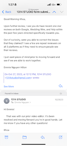 When it came time to deliver the long edits, we made repeated attempts to contact Khoa via his personal number and the company’s main line, left voicemails, sent text messages, and even sent physical certified mail with return receipt—but received no response. This is not a dispute over a small amount like $100 or $200 — it involves thousands of dollars. More importantly, it concerns irreplaceable memories of our wedding, moments we hoped to preserve and one day share with our children.