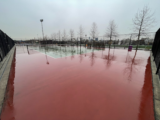 Lighted practice tennis courts without wind screens 🎾 They are on a tilt, far from being leveled but they do dry fast!