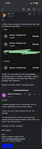 Yesterday, I noticed an unexpected “late pickup fee” charge from Bounce, claiming I had just picked up the package that day. However, I haven’t left my house in days, and as mentioned, I had already picked up my only package on the delivery date back in August.
