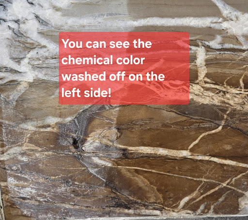 When the stone's many flaws were raised, NY Stone insisted there was no chemical treatment on the stone and kept trying to blame my fabricator, despite his 30 years of experience and the fact that nothing he did in handling the outside could have caused the stone to change so dramatically, all the way down to the (cracked) center of the stone.