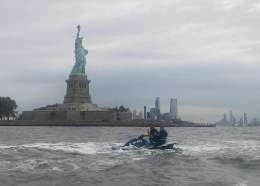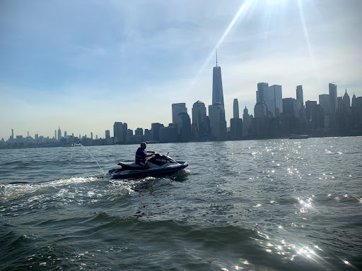 The trip down the East River was a little more challenging than the smooth sail up the relatively calm Hudson. I suppose that the boat traffic makes the East River more turbulent. So, whereas we could keep a steady speed for long stretches on the Hudson, this was not possible on the East River. In the rougher East River, you actually wind up going up "hills" of water; and that is where you have to pull back on the throttle, so as not to send the craft airborne. (The safety video explicitly told users not to let the jet-ski go flying like that.)