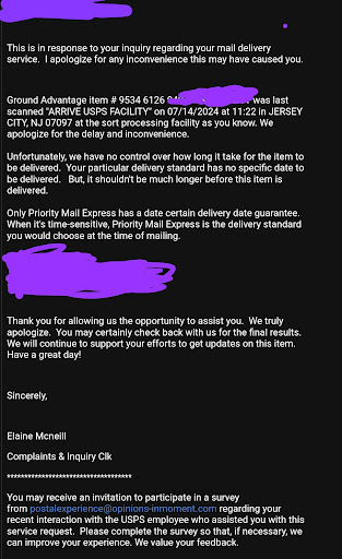 "Thank you for using USPS.com. We regret to inform you that after thoroughly searching for your mail we were unable to locate your missing item(s).