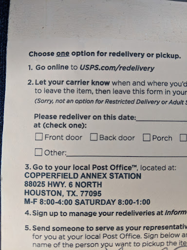 Oh, how Unfortunate for All of us in The Copperfield Area. It would be more Efficient for us ALL when this location Shut Down! Sure then that would lessen The Plethora of Concerns that comes for our Lack of A Good Customer Service and Good Experiences at 8825 Hwy 6 , Copperfield Houston Tx 77095. Bad experiences... Not so Convenient. We need Government employees which like and want to work on a job. Not employees which make you feel like you are interrupting their vacation and visiting their friends @work Really.? And, What do you mean "You don't have time for this."? Look You, I DoNOT see the mail carrier, therefore, I CanNot tell the mail carrier Any Thing. Stop passing The Buck, that's Your job. (...wanting someone to do your job, while you do Nothing and get paid...)
