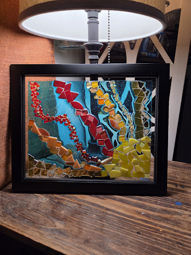 I chose the mosaic art piece. I don't really need instruction or help - just need the materials so I can get to work. It was a slow start as they were trying to set up 9 people at once, but once I got what I needed it was off to the races. They did have templates to use if you wanted but I was freestyling. You tape off the edges and then use resin to 'glue' your tiles directly onto the glass of the picture frame.