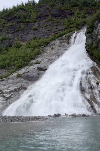 When we arrived, she offered us snacks, drinks, and walking sticks, then guided us on the walk to Nugget Falls and the glacier. She stopped along the way to explain the beautiful plants and flowers and shared the history of the natural formations we were seeing. She paused for us to take photos and took us along the shoreline, providing the best views and a less crowded route to enjoy the stunning landscape. She then brought us directly to the marina to drop us off for the whale-watching tour.