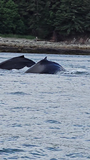 Our family signed up for a guided whale watching tour and nature walk to Mendenhall Glacier thru our cruise ship. We were excited for the excursion but had no clue what was in store for us. We started the day with our guide- Chloe- at the port, then was driven by Lucas to a nearby river where we had views of salmon swimming upstream on a salmon run back to where the salmon were to lay their eggs 3-5 years after their birth (where they too were born) then pass on. We stopped for a few minutes since we had extra time until we were to drive to where our boat was. We arrived at Statter Harbor where public bathrooms were available before we embarked on our adventure on “The Observer” with Captain Leslie. There was a boat toilet on board but didn’t want to miss any wildlife- so be sure to use the public bathrooms before you board your whale watching cruise! While maneuvering to see Humpback whales we were educated about humpbacks- structure, body, behaviors, etc…. very interesting tidbits from Chloe. It didn’t take long before we spotted spouts of breath erupting from the waters. We were in awe. Next we saw bubble net feeding which is not something seen by most humpbacks- they tend to be solitary creatures so seeing a “pack” of ~12 humpbacks in the water surrounding fish with their bubbles- then stunning them in order to capture and eat them…was amazing. This behavior is passed down from humpback generation to generation- not all know how to do this. Little did we know that was only the prelude to the actual show! Other boats began circling around us in the center of the action as our boat just floated. Not long after the first encounter with bubble net feeding did we see more spouts then another bubble net feeding… THEN they started making their way calmly TOWARDS O U R B O A T !!!! Stunned and amazed I just kept repeating “oh my god!!” Eventually they approached SO closely that THREE of the humpbacks dove UNDER OUR BOAT!!! Tears rolled off my face from the sheer delight of being graced by such sentient, graceful beings… it was the most amazing wildlife encounter I’ve ever had. If we had been positioned inside the boat with the open windows we would have had their blow holes tossing air/snot right at us! One of the passengers said she was hit by these “breaths of joy”. Experiencing this changes you- you feel more connected to your surroundings and at peace and are more steadfast in helping these creatures live their lives peacefully. It only further emboldened me to help protect wildlife and their habitat. We only had 12 passengers along with Chloe and Leslie (making it 14 total passengers) on the boat so it was an intimate experience and never felt like we couldn’t get a good look at the action. We left the waters after seeing some seals atop of buoy… feeling at peace and amazed. Next we got back on the bus with new driver Chris and headed to hike at Mendenhall glacier where Chloe talked about the forest and the receding glacier with historical information. We saw Mendenhall glacier in July 2003- and 22 years later there’s so much LESS to see. It’s easy to see the impact of warmer climates and Earth’s rising temperatures have had on the glaciers. As majestic as it was it was sad to know in less than 25 years these frigid suppliers of food and sustenance to aquatic life will likely be melted thus drastically affecting the wildlife that intentionally seek out these glacial waters seasonally. We were provided a set of two snacks- granola bar and chocolate and nut trail mixture along with cups of water. Gastineau Guiding walks the walk and talks the talk. Chloe mentioned they used to distribute thousand of bottles of water for guests every year and needed to make changes. They now source the large container of water from a local company (with local fresh water) that resupplies them for every tour and the cups are composted locally. Even better is if you bring a reusable water bottles like our family does daily!!