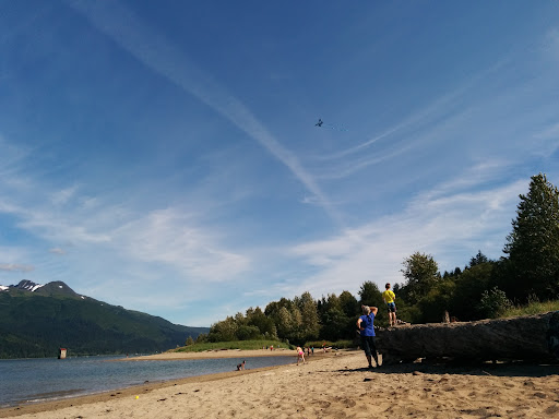 Man-made beach produced from the tailings of the long-gone mining operation whose ruins still stand here and are a favorite tourist attraction and local hangout. High winds make for good kite flying and, if you don't mind the sounds of float planes coming and going from the Lynn Canal, this is a fine place for a sunny day of fun and relaxation.