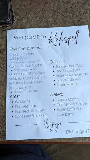Do not staying at their RV park! They overcharge you, saying you've been there longer than you really havw, we stayed one night and he tried charging us for 3 nights at $50/night, the bathroom and showers are almost never open, there are basically no amenities, I definitely recommend finding somewhere else if you're in an rv, other elks with RV parks ask for a $20 donation, not in Kalispell they want $50/night with no amenities, the amenities on their site are a lie as they are only open when the guy running the place wants to open them, which is never, it's also right on a very busy loud corner, nothing about their...