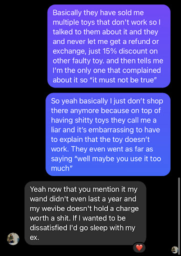 Ā Ā Ā Read moreI am replacing my last review with a photo that says it all. Thanks for nothing, found someone that agrees with me. ānO oNe ElSe HaS cOmPlAiNeDā ummm, yes they have. I was just the only one who doesnāt get embarrassed to tell you they donāt work. You sell FAULTY TOYS and offer nothing when a customer is unhappy. That is a running scam. The toys only work so long and donāt have much power and other people can see. Itās embarrassing to even have to go over this with you! You should just sell quality products! As someone who desires to shop local, Iāve tried so hard with you! But you disrespect your customers. Have you heard that word of mouth can...
