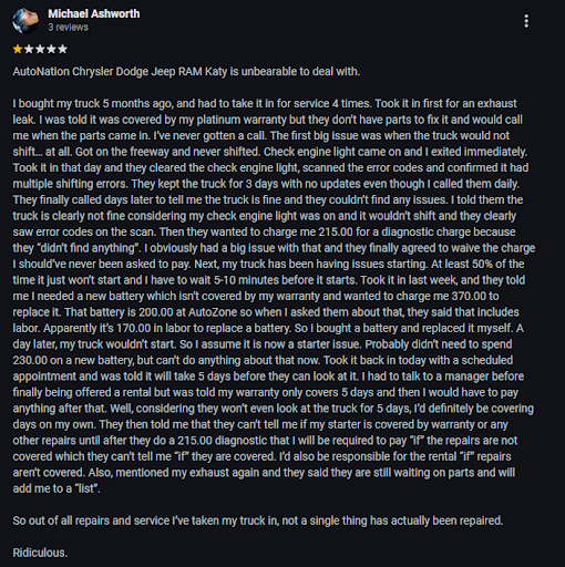 I trusted AutoNation Katy with two major vehicle purchases for my family, and I have been failed both times. This dealership does not stand behind their vehicles, nor do they show any willingness to make things right when problems arise.