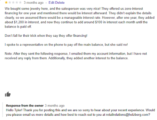 Jewelry can be expensive, as we all know. Helzberg Diamond Outlet is ready to assist by setting you up with financing, if you like, and it’s common to get a twelve-month, interest free offer, making your purchase easy to pay for. They will approve you on the spot and get everything taken care of in a matter of minutes. I like the fact that they aren’t excessively pushy and will make changes to your order, as needed. I came back the day after making a purchase because I decided I no longer wanted the warranty. They removed it from my purchase immediately, no questions asked.