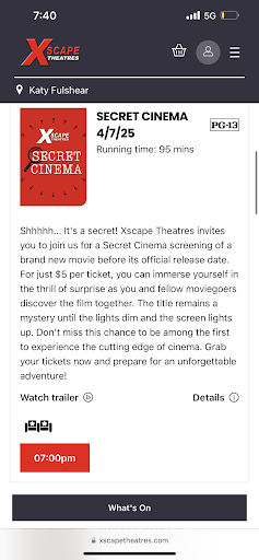 Read moreThis movie theater in Katy serves a purpose and fulfills it quite well. I came to this movie theater to watch Fall Guy will my friends and overall the experience on the giant movie screen (I'm not sure what it's called) was amazing and so was the sound quality. I've also come here for a birthday party and being able to rent a movie theater (again not sure what the term for this is) was great although it was on the smaller side. When i came here with my friends we attempted to bring a 2 liter soda bottle of Mountain Dew through the back of out shirt and we would have gotten it through if it wasn't for our other friend who snitched on me and my friend who were trying to hide the soda (totally inconspicuously) by walking with our backs together which caused us to get the soda taken up from us. The staff was nice about it, until my friend started to be snarky about giving the soda to where they told us we wouldn't be able to get in unless we gave them the soda, but after the movie they gave the soda back to us which is the only reason I took a star off of my review because I would've loved to drink the mountain dew. (I never got to drink the soda after the movie because the friend who snitched got the staff to give back the soda to him before I could and he exploded it in the parking lot) Also, if your still reading this the staff that took our soda away (who was super chill about it) told us that they never check the bags you bring in so if you want to bring snacks just put them...