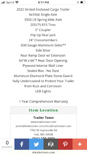 Read moreThe owner, Aaron, is a LIAR and DECEITFUL! Good luck getting your title. Paid for my trailer when I got it. Start doing paper work, they verify my cashiers check, give me a receipt, title application and say to wait 2 weeks for the title to come in the mail. It has now been 4 weeks, the temp tag on the trailer expires after tomorrow and I'll owe a penalty on titling. Every time I've called them over the past 2 weeks, their response has been "We mailed it," and "Give it a few more days." Or I can pay another $100 for a duplicate title. They can't even prove they mailed the first one! I would never buy anything from here again nor recommend them to anyone I know. Posted on 01JUL2021.