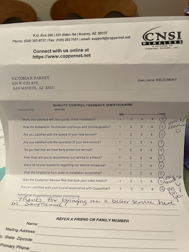 Read moreI've had Coppernet for quite a few years now as they are the essentially the only reliable unlimited service provider in my area. I currently follow their FaceBook page and am happy to see they are working on upgrades that will enable them to better serve people in rural communities (Superior, Kearny and Globe) that do not have many options when it comes to internet. I cannot say enough about their customer service, as it has been top notch! I had an issue with slower speeds so I called and the phone rep quickly got me over to a tech who worked with me to troubleshoot the issues. I was still having some lag in speed so they promptly scheduled a time to come out and inspect the equipment in my home at no charge! This alone speaks volumes for me as I had Exede prior to CopperNet and anytime I needed assistance the telephone customer service was horrible, hard to understand and RUDE, not to mention the outrageous service/tech charges for anyone to come out and look into the issues! James and his team went above and beyond to troubleshoot and correct my issues. They were also nice enough to follow up after the issue was resolved to ensure I was happy and the speeds were good. Thank you CooperNet for providing service to our rural communities that don't have...