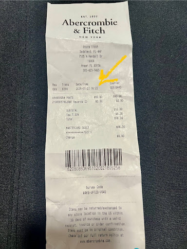 Update: The next day, I received response from the district manager and a call from the store. The culprit has been identified and the situation will be dealt with. Impressed with A&F's customer service. We're cool now.