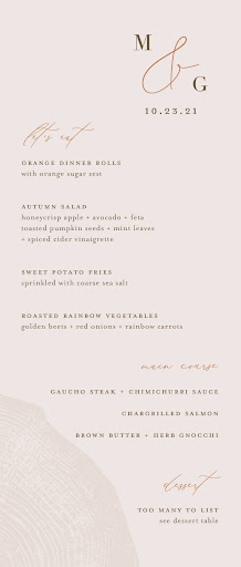 Entrees Orange Dinner Rolls (a family recipe) Fall Harvest Salad (served in mini kraft takeout containers that looked so outdoorsy, rustic, and perfectly matched our wedding theme.) Sweet Potato Fries (they were extra crispy and so yummy!) Roasted rainbow carrots, golden beets, and red onions (veggies that were so scrumptious, there weren't any leftover!) Gaucho Steak and chimichurri sauce (how can so much flavor come from a simple sauce?!) Chargrilled Salmon (I don't order salmon at most restaurants bc they usually overcook it ... not Alex, he cooks his salmon so it's tender and yummy) Brown butter and herb gnocchi (Vegetarians loved this option!)