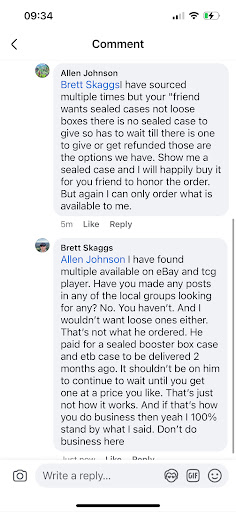 Do not do business here. Me and my friend pre ordered cases of destined rivals and prismatic evolutions etbs and they never came through. Waited weeks and kept getting excuses that they would show up and to be patient. Asked for a screenshot or an invoice showing they were actually ordered and was told he’d send one when their computer was back up due to renovations. Kept waiting and waiting and asked more for proof but was then told by the owner that he didn’t need to provide that and he was doing all he was required to do. Then when he finally decided to show “proof” the “proof” he showed wasn’t even proof. They were of loose etbs that he ordered after we were already supposed to have our cases in hand. He will make excuse after excuse for every issue. I requested a refund and he sent it back through square. The refund never came through. Showed as pending for a few days then didn’t go through. Even called my bank and they confirmed it didn’t go through. Again. He made more excuses about square giving him issues and said he was going to use another service in the future and leave square. Ended up having to do a chargeback through my bank. Surprise surprise he is still using square. One of my friends decided to wait and hope the cases he ordered would come through but it’s been 2 months and they still haven’t. After pressing him more the owner said his options are to get a refund using square (lol) or to wait till his distributor has more. Neither of those are acceptable options. He was supposed to have them in hand 2 months ago but doesn’t. So instead of making it right and fixing it himself he says my friend has to wait even longer. At this point I’m pretty sure this guy is just running a scam. 0/10 do not do business here. I was out 2300$ for weeks because of this guy. Also I can back up everything I said with text messages and screenshots so I would love to hear the excuses and bs the owner is going to come up...