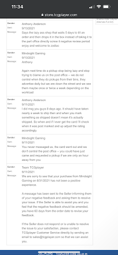 Read morePlaced order on tcgplayer.com from this store and after nearly 2 weeks only living an hour away they had the nerve to call me lazy for not coming down to pick up my online order that I paid shipping for due to their horrible shipping speed and communications claiming I never sent. Smaller image is proof of original message and longer msg is how great this business is at customer service AVOID