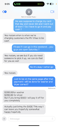 Read moreIf I could give -100000000 stars I would because the amount of stress that this caused me ! I would have washed my clothes by hand at this point ! So long story short I got a washer dryer combo then out of no where the dryer was making noises they took it to get “FIXED” but two weeks later they came to give it back with the same noise so I call they send me a different one and say to keep that one instead no extra charge everything is peach’s ! Then BOOM I start getting charged 79 something when I payed 56 mind you on auto pay each month for about a year then they wanna tell oh no your late the “SYSTEM “ keeps kicking your card out that’s why the high payments like what and mind you this happens for a whole MONTH ! I finally call corporate and that’s when the truth comes out ! They proceed to tell I signed for NEW AGREEMENT that I NEVERRRRRRRRRE signed for I’m no lawyer but that’s sounds super ILLEGAL !!!!! ANYWAYS they signed without my consent and it took for me to call corporate because the so called MANGER is literally the worst customer service in the world couldn’t do anything but accuse me of not paying and being super rude ! so unless you want to waste your money and time and never get answers unless you call corporate then please BUY FROM THEM LOL! But if your trying to avoid people scamming then stay far away from this location ! Look at the message that’s should be enough proof ! They tried to make me pay it off cash for a corporate company that’s wild ! Ps-I’m a single mom so imagine how many people they do this to...