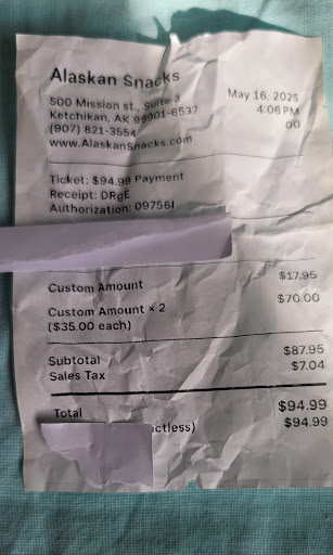 I gave 1 star and posted this some weeks ago... "Beware of this place. We bought 5 bags of salmon jerky and didn't realize they were unnoticebly open on the bottom... thus, the salmon was rotten. Sadly, no souvenirs for our family and money lost..."