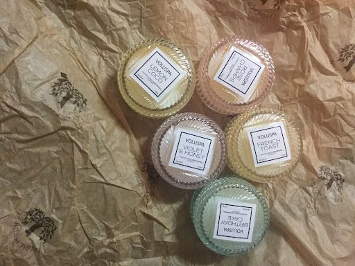 I ordered a gift set from Willow Papery. This gift set contains 5 candles in tiny glass jars with glass lid. They all arrived safe and sound, and carefully (very carefully) and thoughtfully wrapped. I am very detail oriented and this is the first time I feel like I could not have done a better job myself.