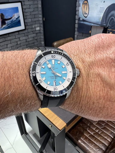 The adventure started when Andrew and the store manager Peter pleasantly greeted us and started our 4 hour journey into watch “Bliss”. They had full product lines from Omega, Breitling, Tag, Rado, Longines, Tissot, Shinola, Bulova, Hamilton, and Movado on display and ready to be purchased. So basically, something for everyone at all price points. It was clear after our intro that Andrew was a true WIS in every sense of the word. I always get a little anxious going watch shopping but he made the experience painless and extremely enjoyable. No high pressure sales tactics here, just a few friends discussing the latest and greatest that Omega & Breitling had to offer over a couple of rum and cokes! I was initially interested in purchasing my first Breitling but my friend had commandeered the counter and was clearly going down the rabbit hole with the store manager Peter. That left all the Omega’s for my perusal, which is fine by me since I really love the brand and have a few at home. Unfortunately, no Ed White or Snoopy but I loved trying on the other Speedy Pro’s, including the gold Moonshine, both Hesalite and Sapphire, and Moonphase models. Then Andrew threw me a curve ball. He brought out 2 PO Ultra Deeps that they had just received. One with a white dial and the other with a gradient blue to black dial. Always thought the PO line was beautiful in pictures but to see the Ultra Deep outside in the sunlight, all I can say is WOW! Omega hit this offering out of the park. That said, I didn’t get my first Breitling but I did get a grail watch in the Ultra Deep with the blue to black gradient dial. After a week on the wrist I can say the watch rivals anything I have from Rolex in regards to fit, finish, and accuracy, which has been perfect; not gaining or losing any time over the last week.