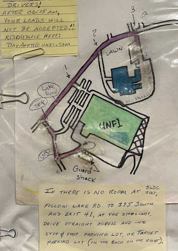 Check in at guard - little shelter or at receiving. They will ask you to park at another nearby place which is awful due to the road condition that can damage your truck. They will call you and say the # of the bay that you need to backup You will wait loooong time until they will start to unload and it takes long time too. When they finish, you can wait at the same spot until they call you. You got your paperwork (Finally my congratulations!đ)