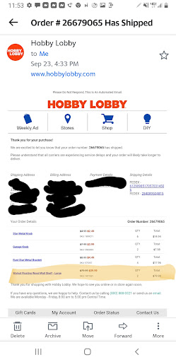 Read moreI've stopped at Hobby Lobby for many years. HL WAS one of my favorite stores. I recently moved and don't have a HL near me anymore SO I did a online order AND one of two of my items (shelves) had arrived broken. Broken as in it was made defective, the staples wasn't actually holding the wood together and was on the outside of wood instead of actually being in the wood to hold it together.